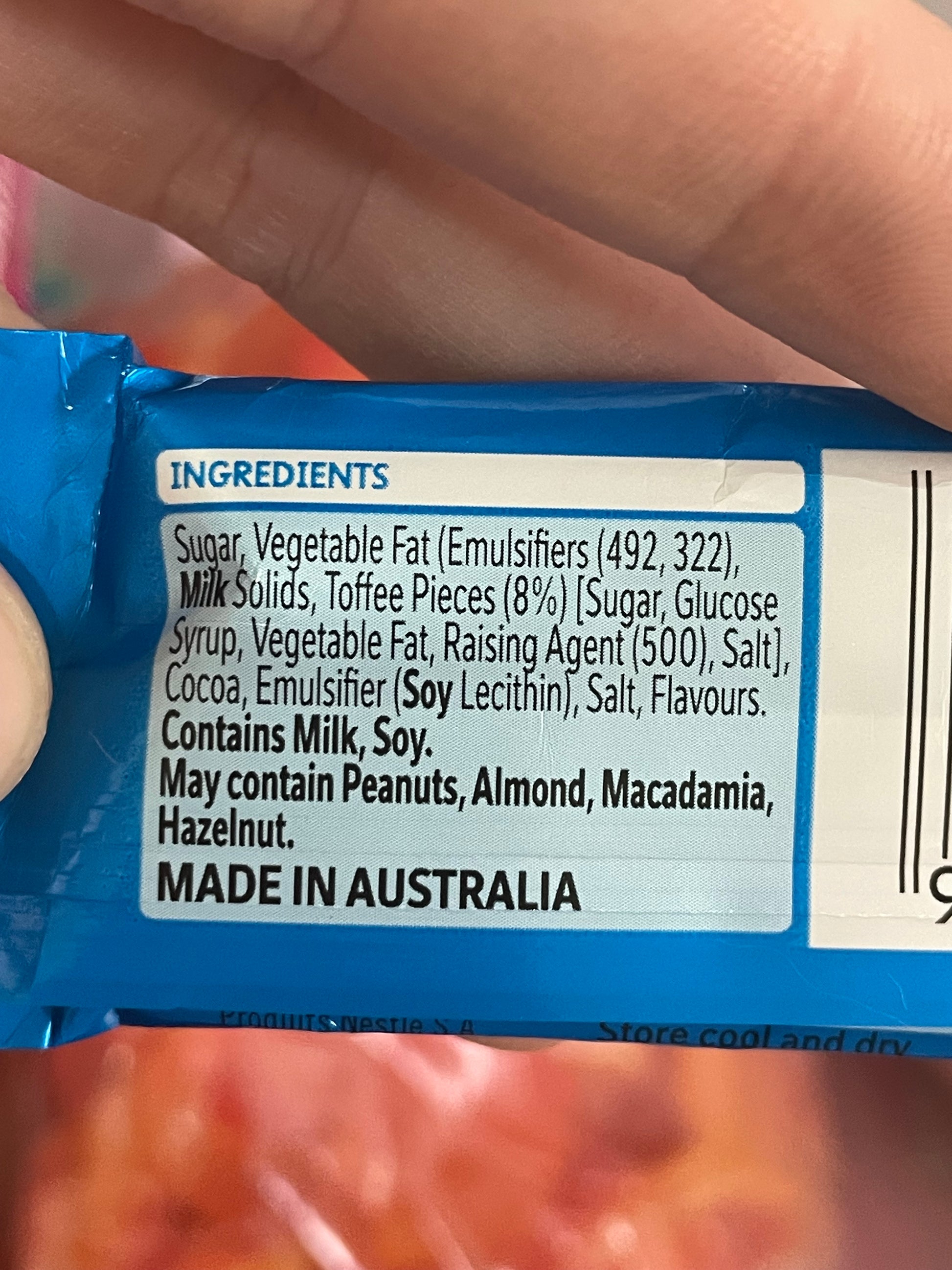 Sugar, Vegetable Fat, [Emulsifiers (Soy Lecithin, 492)], Milk Solids, Toffee Pieces (8%) [Sugar, Glucose Syrup, Vegetable Fat, Raising Agent (Sodium Bicarbonate)], Cocoa, Emulsifier (Soy Lecithin), Salt, Flavours.